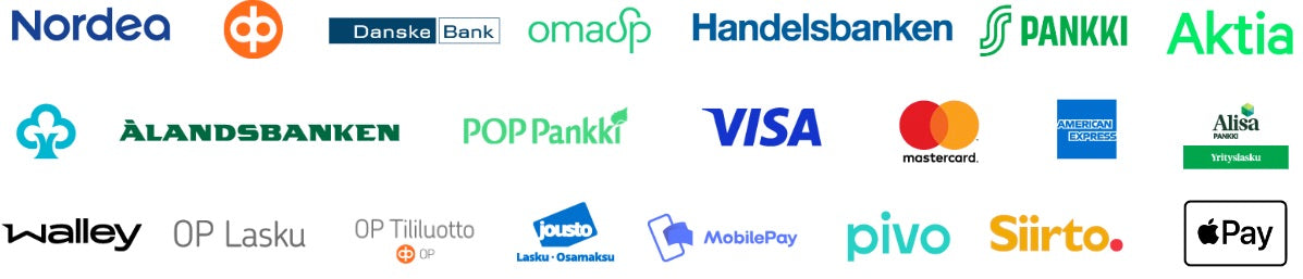 - Verkkopankit: Maksa tuotteet suoraan omasta verkkopankistasi. Tukeemme kuuluvat kaikki suuret pankit, kuten Nordea, OP, Danske Bank, ja S-Pankki.